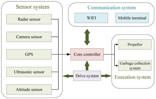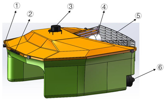 (1) Utilizing SolidWorks 2022, a three-dimensional model of the robot’s appearance and structure was established. This encompasses the overall shape of the robot (catamaran), propellers, and foam collection device. Subsequently, the model was exported as an STL file, which was converted into COLLADA format. Throughout this process, the geometric information of the robot model was preserved, allowing effective loading and utilization within the ROS system.The overall structure diagram of the robot system is as shown in Figure 2.