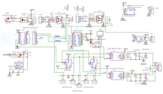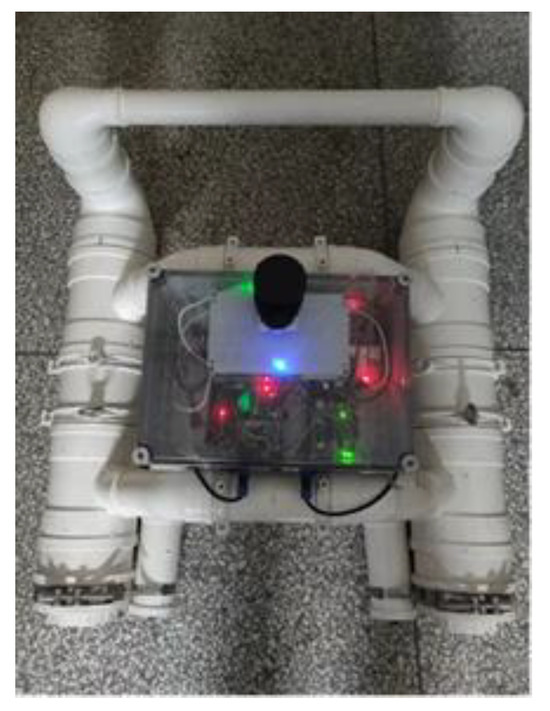 (2) Based on the actual shape, color, dimensions, mass, and inertia parameters of the robot, a URDF file was written to provide a detailed description of the robot’s structure and characteristics. Among these, the robots could be approximated as dual-body ship models, with maximum lengths and widths measuring 70 cm, maximum height of 40 cm, and a mass of 20 kg. The URDF file encompasses definitions for the robot’s joints, sensors, and links, and specifies their relationships and constraints. This file enabled the ROS system to comprehend and simulate the physical attributes of the robot, providing an accurate robot model for subsequent tasks such as simulation, control, obstacle avoidance, and path planning. Figure 3 illustrates the schematic of the robot’s structure, Table 1 lists the inventory of robot components, Figure 4 depicts the physical representation of the robot and Figure 5 shows the controller circuit diagram.