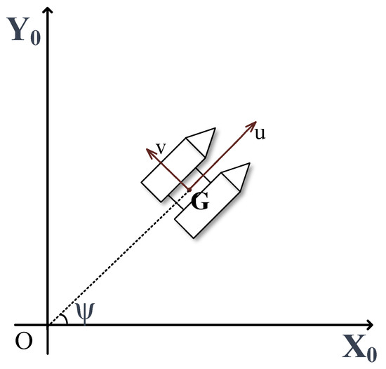 In Equations (2) and (3), u and v represent the longitudinal and lateral velocities of the robot, respectively, while r is the rate of change of the robot’s heading angle concerning time. , , and denote the external forces and moments acting on the robot in the inertial coordinate system. X, Y, and N represent the external forces and moments acting on the robot in the body-fixed coordinate system. and are the coordinates of the robot’s center of gravity G, is the coordinate value of the robot’s center in the body-fixed coordinate axis, and is a correction term.