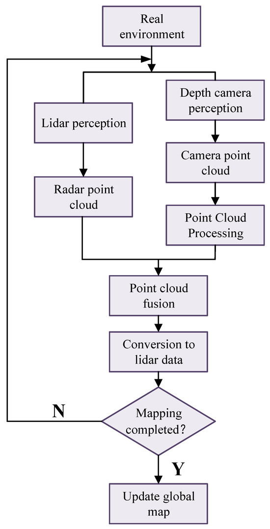The construction of the working scenario formed the foundation for the successful operation of the robot. In constructing the scenario, this paper integrated a laser rangefinder and depth camera through sensor fusion in the ROS environment [20]. Multiple sensors were utilized to provide rich environmental information, and data fusion was employed to achieve complementary benefits from the sensors, thereby reducing the measurement error and enhancing the robot’s robustness.The workflow for constructing the work scene map is shown in Figure 7.