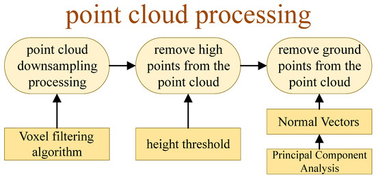 The environment point cloud published by the depth camera contained many redundant points. In the context of this paper, where the robot could be approximated as a ground robot, excessively high walls and ground points did not contribute to obstacle information for mapping. Therefore, it was necessary to filter out these points. As shown in Figure 8, this is the process diagram for depth camera point cloud processing.