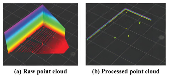 First, downsampling was applied to the point cloud produced by the depth camera. The point cloud was then converted into a format that the PCL library could process. Voxel filtering was performed to filter the point cloud, significantly reducing the number of points, while preserving the shape features. Subsequently, a height threshold was set to remove excessively high points, retaining obstacle points on the ground. Finally, ground points were removed using the standard vector method. The average vector for each point was calculated using the principal component analysis method for a given point cloud data. The average vector was considered as the plane normal vector, and by fitting the point cloud data to the plane model, the plane equation was obtained as , where is the plane average vector, and is the coordinates of the point. Each point’s coordinates were substituted into the plane equation, and the points that satisfied the equation were considered ground points and were removed from the point cloud. In Figure 9, both the raw point cloud data from the depth camera and the processed point cloud data are presented.
