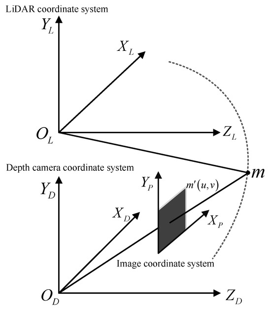 Figure 10 shows the coordinate relationship between laser radar and depth camera. In Figure 10, the detected object has coordinates in the depth camera coordinate system, in the laser rangefinder coordinate system, and projection coordinates in the image coordinate system. For the depth camera, the collected information of point m includes the projection coordinates and the corresponding depth information . The laser rangefinder scanned and obtained the distance and angle between the radar and the object. Here, represents the angle between the detected object and the axis. Based on the geometric relationship between these two coordinate systems, the transformation relationship of the detected object between the two coordinate systems could be derived as follows: