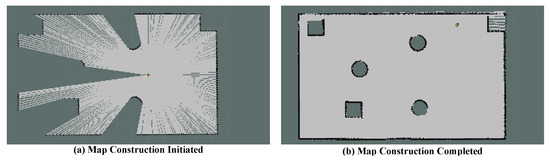 After merging the two sets of point clouds, the combined point cloud was input into the Cartographer algorithm to complete the construction of a two-dimensional plane map [21]. The map construction involved two main steps: local submap construction and global loop closure optimization. In this process, a submap was defined as a frame of the merged point cloud, and loop closure detection was based on the entire submap.