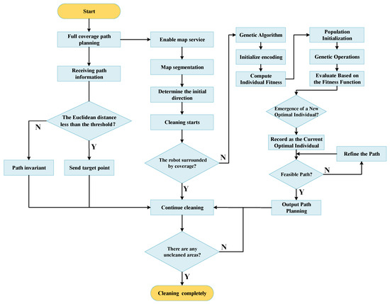 In the process of full coverage path planning for the robot, considering the relatively stable environment of the fuel-depleted pool and aiming to enhance the simplicity and adaptability of the algorithm, as well as taking into account the computational limitations of the robot itself and the goal of minimizing robot energy consumption to the greatest extent possible, this paper adopted behavior-based coverage. The basic process of behavior-based coverage is as follows: (a) Initialization: Set the starting point of the initial path in advance. (b) Consider the robot’s size sufficiently, and partition the map into appropriately sized grids. (c) The system generates the robot’s motion path and determines the initial direction. Upon determining the path, obstacles are detected, and if the robot detects an obstacle, the path is discarded; otherwise, it is considered a candidate path. (d) From all the candidate paths, select the path with the shortest length as the final path. (e) In actual movement, the robot will move linearly in the environment along the path. When an obstacle is detected, it will rotate clockwise 90° to achieve an S-shaped movement. Suppose the area around the robot has been completely covered. In that case, the path is determined by applying a genetic algorithm [22,23] from the current robot position to the endpoint of the uncovered area. This process is repeated until the entire cleaning task has been completed.
