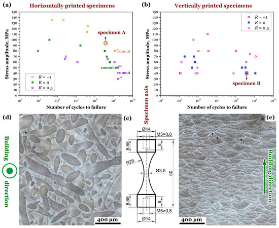 Fatigue properties and microstructure of an additively manufactured aluminum alloy. S-N data for horizontally (a) and vertically (b) printed specimens; (c) specimen geometry, dimensions in mm; optical micrographs showing scanning tracks and melt pools on latitudinal (d) and longitudinal (e) sections along the building direction.