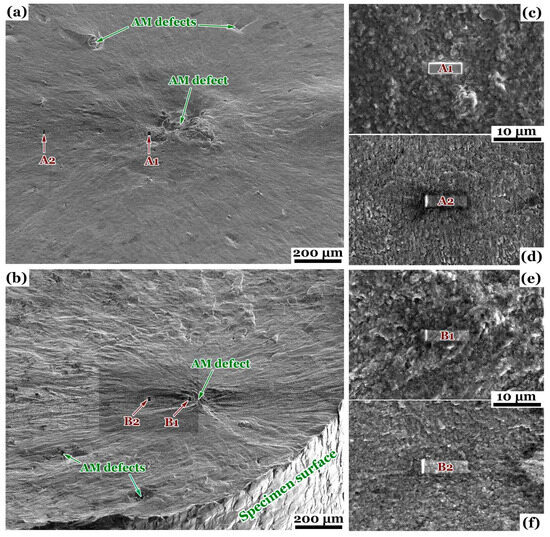 In comparison with Figure 2a,b, there is no obvious difference in the fracture surfaces of specimens A and B, except that the FiE area of specimen A is larger than specimen B, the size of the AM defect-induced VHCF in specimen A is greater than specimen B, and the crack initiation site at specimen B is comparatively closer to the specimen surface than specimen A. The main crack of VHCF originated from an AM defect which is the biggest one on the FiE region.