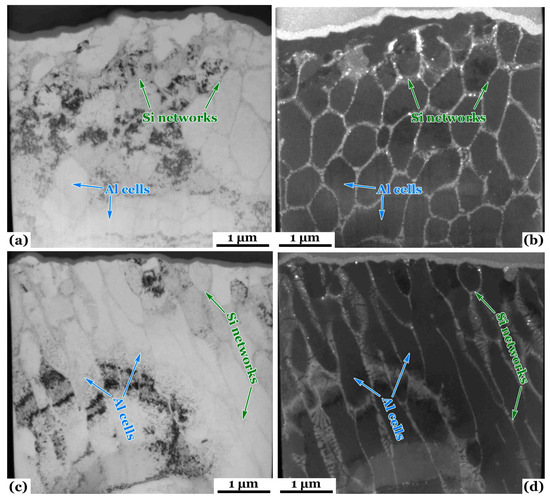 In Figure 3 and Figure 4, Si networks and Al cells are typical microstructure features with characteristic size of sub micrometers. Basically, Si-rich regions are interconnected with each other to constitute a continuous web of Si networks, and the rest can be regarded as many isolated islands, namely Al cells. In TEM samples A1 and B1, Al cells and Si networks are near-equiaxed; and in samples A2 and B2, Al cells and Si networks are all elongated. It is noted that the elongation in samples A2 and B2 are with different directions. In comparison with Figure 3a–d and Figure 4c,d, there is only one grain of Al solid solution in sample A1, A2, and B2. This means that all Al cells are with the same orientation, and most of the Si networks keep another same orientation in these samples. In comparison with Figure 4a,b, only a few (two or three) nanograins with size about hundreds of nanometers appear in the upper right corner of sample B1, and the grain boundaries are clearly visible. In the neighbor of nanograins, there is still only one big grain whose equivalent size is larger than 6 μm.