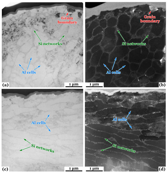 In each subfigure of Figure 3 and Figure 4, VHCF loading direction is along the height of the image, and the uppermost curve of the microstructure corresponds to the fracture surface profile. Above the profile curve, there are two protective layers of platinum, the inner one was guided by electron beam, and the outer one was guided by Ga+ cations, as described in Ref. [4]. In bright-field images of microstructures, the light areas are Al-rich regions, and the gray areas are Si-rich regions. Contributing to different crystallographic orientations of Al and Si [44], the Si-rich regions are quite easy to identify in dark-field images. Contrary to the situation in bright-field images, for dark-field ones, the black areas are Al-rich regions, the white areas are Si-rich regions, and the sparkling particles might be rearranged Si precipitates according to Ref. [17]’s opinion.