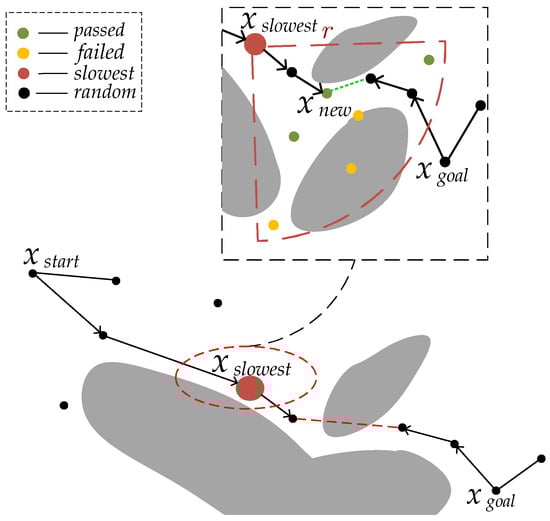 If there is no node with the slowest expansion speed, the current iteration is skipped, moving to the subsequent iteration. This means that, without a clear determination of unexplored areas, no additional sampling will be carried out, but regular search steps will continue to be performed. This step is carried out to ensure the robustness of the algorithm, which can function normally even in special circumstances. (Algorithm 1. 11–15)