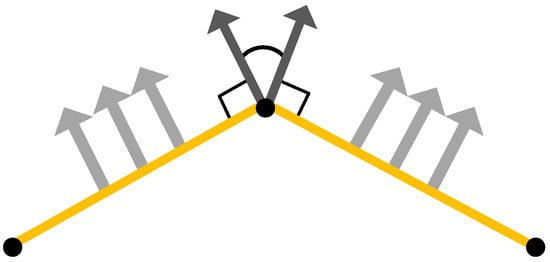 It is known that the tangent vector or normal deflection angle of the curve’s start and end equals the integral of the curvature length. For the polyline in Figure 4 below, the normal vector only changes at each vertex, so our goal is to find out the curvature at each vertex, but the change in the normal vector at the vertex jumps, as shown in Figure 4; the gray arrow denotes the discernible change in the vertex on the line segment, recording the turning angle of the curve.