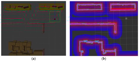 Under the L-shaped obstacle environment. (a) Gazebo environment in simulation I; (b) RVIZ environment in simulation I.