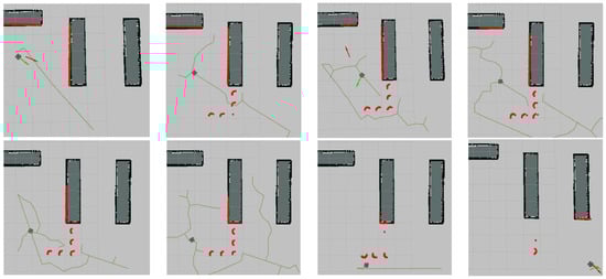 Figure 11 shows a path planning process using the DBR-RRT algorithm. This design makes the robot unaware of these obstacles at the beginning of the initial navigation task. However, when the robot approaches these obstacles, its internal LiDAR can effectively detect them and successfully use our algorithm to plan new paths to avoid these obstacles. Real-time robot planning trajectories were acquired and visualized by subscribing to pertinent topics, offering a clear perspective of the robot’s current state. In this experiment, the target point was set in the lower right corner. In this case, the robot had to detour around five “suddenly appearing” obstacles. By incorporating such challenges, the robot was predisposed to encounter obstacles early on, positioning itself in potentially hazardous zones surrounded by impediments. This setting allows us to visually observe and compare the robustness and planning efficiency of the two algorithms.