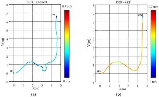 RBG color mapping was employed to vividly convey the robot’s speed information on its travel path. As shown in Figure 12b, the proposed algorithm enabled the robot to have a faster average speed compared to the RT-Connect algorithm, and the speed could be smoothly transitioned during the overall path planning process. In Figure 12a, there are meanders in the robot path and there are multiple instances of sudden velocity mutations. The traditional RRT-Connect algorithm exhibits serious problems when dealing with local optimal solutions, causing the robot to fall into a state of spinning in place. In this case, the robot’s speed exhibits an extremely unstable acceleration and deceleration process, even approaching zero. Therefore, the repeated rotation of the robot resulted in a significant increase in the overall path planning time.