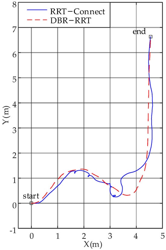 In Figure 18, the robot’s movement trajectory is displayed on the Rviz visualization platform. The actual motion path of the DBR-RRT robot is represented by green lines, while the actual motion path of the RRT-Connect robot is represented by red lines.