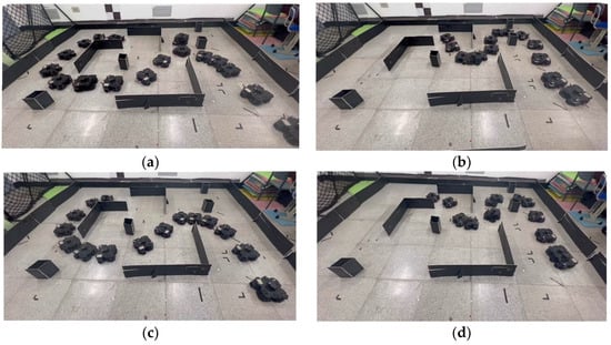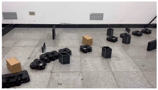 This experiment was conducted to validate the scenario simulated in Experiment 1: avoiding unknown obstacles in a known map. A physical experimental environment was set up, where black objects represent known obstacles in the known environment, and brown obstacles represent the unknown obstacles. The experimental site contained four black rectangular obstacles of 20 × 20 × 30 cm, two black rectangular obstacles of 26 × 8 × 16 cm, one black rectangular obstacle of 30 × 13 × 40 cm, one black rectangular obstacle of 35 × 15 × 30 cm, and two brown obstacles of 20 × 35 × 30 cm. Additionally, the robot’s navigation process was captured in a sequence of 80 frames, documenting the real robot’s trajectory.