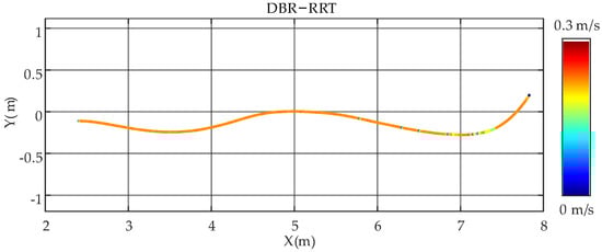 The experimental results show that the RRT-Connect algorithm takes the least amount of time among all the reference algorithms, this is due to the bidirectional search strategy adopted by the RRT-Connect algorithm, which can quickly discover effective paths from the starting point to the end point. However, its standard deviation is large, and the speed profile shown in Figure 10 is rugged, and the excessively fast search speed sacrifices some stability. In addition, the proposed DBR-RRT algorithm inherits the bidirectional search strategy of RRT-Connect, and although the average running time is slightly longer than that of the initial RRT-Connect algorithm, the speed has a smaller standard deviation and possesses the largest maximum speed, which indicates that the speed fluctuation between each run is small, and it achieves a balance between increasing the average speed and maintaining less speed fluctuations. Although the RRT algorithm needs to consider more candidate paths in the process of finding the optimal path, and thus consumes the longest time, it is clearly unnecessary to sacrifice time to find the optimal path in a simple L-shaped environment. Compared with DBR-RRT, Informed RRT* can theoretically improve the efficiency of path planning through conducting a more informed search, but in this test environment, its efficiency does not exceed that of the other algorithms, and the large fluctuations in the velocity curves shown in Figure 10. indicate that the algorithm has a large variation in the robot’s velocity when planning paths.