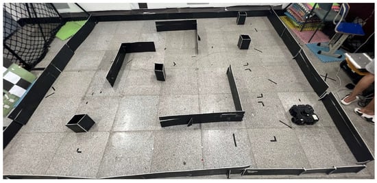 To test the effectiveness of the proposed algorithm in path planning over long periods of time, an environment full of obstacles was designed. In this experimental site, as shown in Figure 16, four rectangular obstacles of 20 × 20 × 30 cm, one L-shaped obstacle consisting of two long rectangles of 100 × 6 × 30 cm, and two L-shaped obstacles consisting of 85 × 6 × 30 cm and 60 × 6 × 30 cm were placed. The parameters and environmental parameters set by the robot are consistent with Experiment 1. The starting point was anchored in the map’s bottom right corner. To enhance the evaluation of the robot’s performance in the real environment, goal commands were issued at strategic points on the map to enable the robot to navigate once in the complex environment.