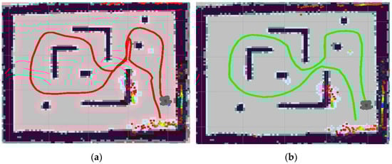 The actual mobile robot’s going and returning using the two algorithms are shown in Figure 17, respectively. Given the overlap between the robot’s outbound and return paths, to prevent any visual confusion within a singular image, the decision was made to separate the actual trajectories of the two path-planning methods. These are represented in two distinct images, showcased through frame extraction and overlay. An optimal selection of 80 frames was made to authentically depict the robot’s movement trajectory.