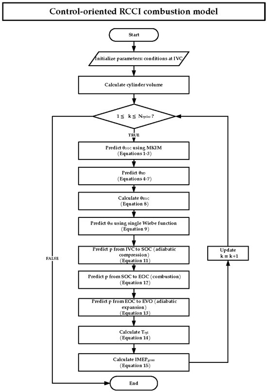 Flowchart of the developed RCCI control-oriented combustion model for predicting main combustion indicators.