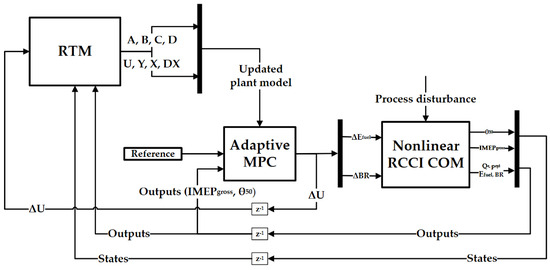 Marine engines have also traversed towards the RCCI within the field of low-temperature combustion in the recent years. Many novel modeling methodologies have been developed, especially in the form of multizone models (MZM) [5,25,26]. However, the model-based control of RCCI combustion is at its initial stage in non-road and marine sector. It is also worth mentioning that the current multizone models could be used as plant models for RCCI control, but they do not enable real-time simulations due to their long calculation times. To the authors’ knowledge, this is the first paper that covers model-predictive control of RCCI combustion for marine engines. The work presents a MIMO control system consisting of a phenomenological RCCI combustion model, a state-of-the-art LPV model called the real-time model (RTM) [14] capable of simulation time in order of milliseconds and an adaptive MPC, which updates the aforementioned RTM for each engine operating condition and their transient. The main contributions of this work compared to previous studies are: