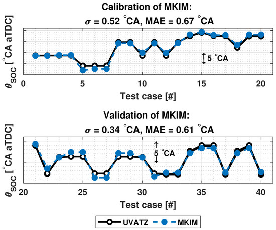 The first half of the dataset presented in Table 4 was used for calibrating and the second half for validating MKIM, Wiebe and burn duration models described in the previous section. To be more specific, the calibration dateset was used to tune the coefficients presented in Equations (1), (4), (9) and (11). Figure 3 presents the parametrization results of MKIM. Here has been chosen as . The model achieves a mean absolute error (MAE) below 0.7 °CA for all cases as well as a good trendwise accuracy as indicated by the standard deviation of MAE ().