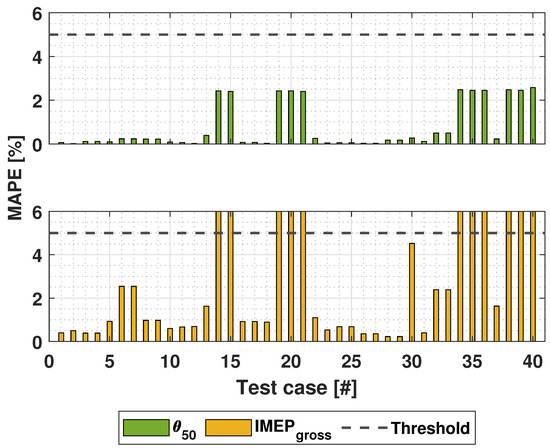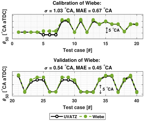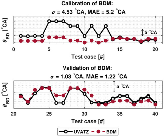 The BDM was calibrated by choosing crank angle at 80% energy released () as the . In most applications crank angle at 90% energy released () is chosen to indicate the end of combustion. However, is often difficult to estimate. Additionally, based on observations on the results of mixed-factorial design, the results of estimated by the UVATZ had less deviation compared to . The parametrization of BDM has higher absolute error in the first 13 test cases of the calibration data, as shown in Figure 4. However, the trendwise accuracy is good, although it is not well observable from the figure. The overall validation results are feasible with a MAE below 1.5 °CA. It is worth mentioning that calibration or validation error outside of 1–2 °CA threshold is still acceptable and corresponds to real-world applications. In addition to that, high calibration MAE of BDM might be due to the model’s sensitivity to those particular test cases.