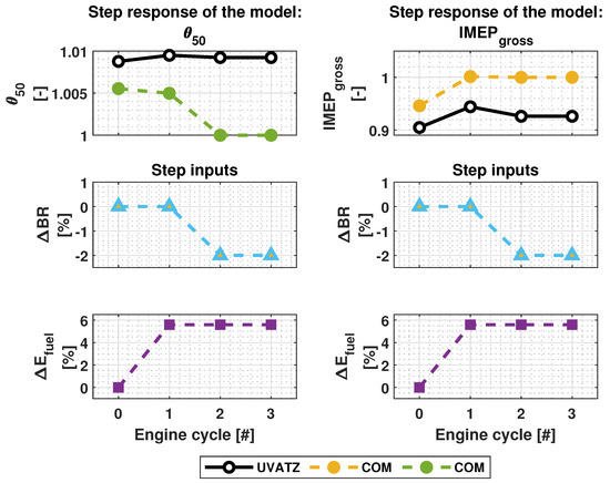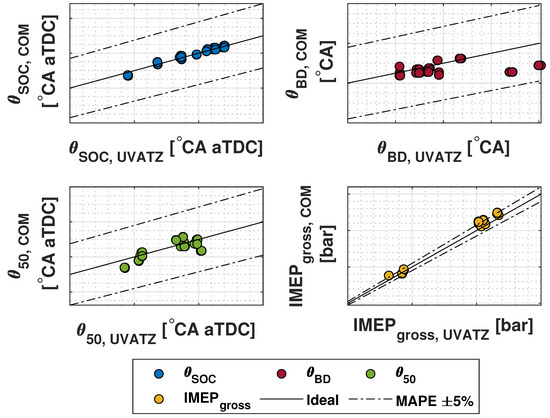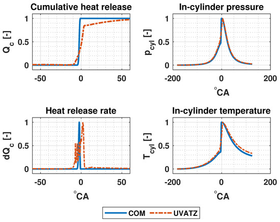 After parametrization of the MKIM, Wiebe and BDM, the RCCI COM was simulated to further validate its coupled submodels and the remaining combustion indicators, i.e., against the UVATZ model for full engine cycle, which was presented earlier in Figure 1.