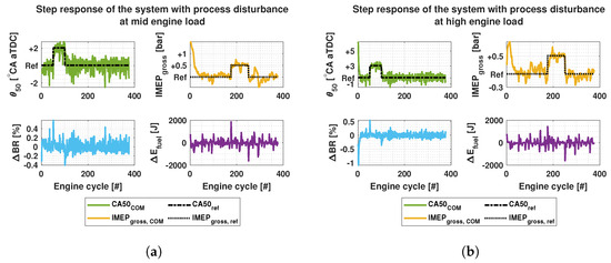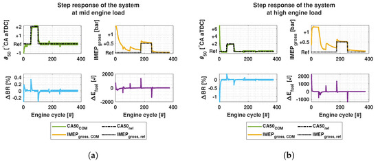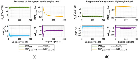 In [23], an optimal controller was developed to control the in-cylinder pressure and, subsequently, to evaluate the thermal efficiency using total fuel energy, BR and as control signals to achieve an optimal fuel path. Guardiola et al. [24] controlled IMEP, and combustion centroid (CC) with PI-controllers obtaining a steady state error of 0.13 bar, 0.5 °CA and 0.52 bar/°CA for IMEP, CC and , respectively. Unlike most of the aforementioned works, which focus mostly on controlling the fuel path of an RCCI engine, Verhaegh et al. [15] developed a robust multi-input and multiple-output (MIMO) feedback control methodology to control the airpath of an RCCI engine using fuel quantities, , variable geometry turbocharger (VGT) and exhaust gas recirculation (EGR) valve positions to control emission, and for transient engine operating conditions. Their closed-loop system achieved tracking errors of 0.24 bar and 0.45 °CA for IMEP and , respectively, while reducing emission by 12.8% and by 3.8 bar/°CA with respect to baseline conditions.