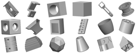 It is necessary to use the slice program to calculate material consumption and fabrication time according to different raster angles of 3D models created in the computer environment. In this study, the Zaxe XDesktop commercial slicing program was used, and the training data required for ML was created. Pieces with different geometries (rectangle, cylinder, and sphere, etc.) were used as models (Figure 1). Data were created by changing seven different raster angles (0°, 15°, 30°, 45°, 60°, 75°, and 90°) and three infill densities (30%, 60%, and 90%) for the Zaxe Z1 Plus open-source 3D printer.