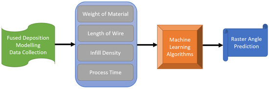 The use of ML algorithms is expanding day by day in the AM process. These algorithms will significantly contribute to improving the fabrication process [31,32]. In this study, we used ML algorithms to estimate the raster angle to ensure the minimum material usage and fabrication time in the FDM, regardless of the model. The prediction and modeling processes were performed using five different ML algorithms. These algorithms include a support vector machine (SVM), Gaussian process regression (GPR), an artificial neural network (ANN), decision tree regression (DTR), and random forest regression (RFR). The implementation of advanced ML algorithms for the prediction of the best raster angle for different geometries conclusively reduces a product’s cost without manipulating its quality. The training data created using different shapes and geometries was trained in the software, and a prediction model between the input parameters and the raster angle was created. A total of 50 model designs were made, and as a result, a dataset of 1050 lines was created. According to the performance criteria applied to the prediction models, the accuracy of RFR was determined to be higher than that of the other ML algorithms. The novelty of this study is that the implementation of ML for FDM raster angle prediction has never been implemented. The findings of the study will contribute to the growth of the AM industry by reducing the product lead time and cost without compromising accuracy. The proposed model can predict the optimum raster angle for any geometry, which will further increase the applicability of digitally fabricated parts.