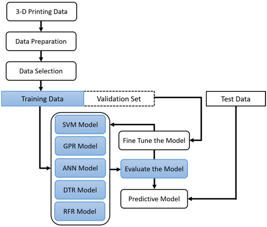 In this study, five different ML algorithms were applied using the MATLAB software in the prediction process. The aim of this study is to determine the model’s estimation efficiency for suggesting the appropriate raster angle of a new part. Five performance criteria, including mean squared error, mean absolute error, root mean squared error, R-squared, and explained variance score, were employed to test the performance of the proposed model using the cross-validation technique. Algorithms must be trained using experimental data to develop the ML-based process shown in Figure 2.
