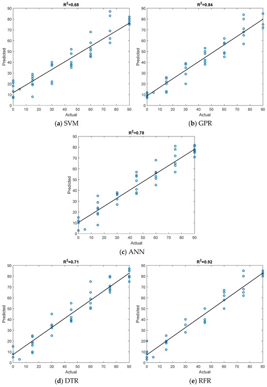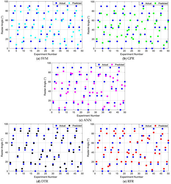 Figure 7a–e shows the scatter plots for the predicted versus experimental raster angle using ML models. Generally, all developed ML models showed a good correlation between the experimental and predicted raster angle. Among the models, SVM demonstrated the least predictive performance on both test sets, while RFR demonstrated the highest predictive performance, as can be seen in Figure 7. The predicted raster angles are well concentrated around the diagonal line, representing an excellent match between the predicted raster angle and the corresponding experimental values (Figure 7e).