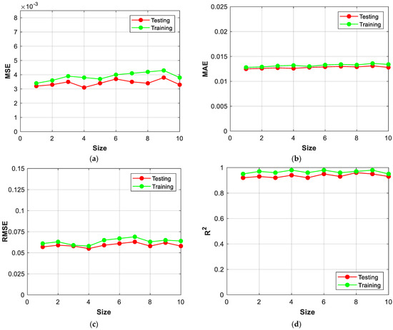 Cross-validation of the testing dataset employing RFR for (a) MSE, (b) MAE, (c) RMSE, and (d) R2.