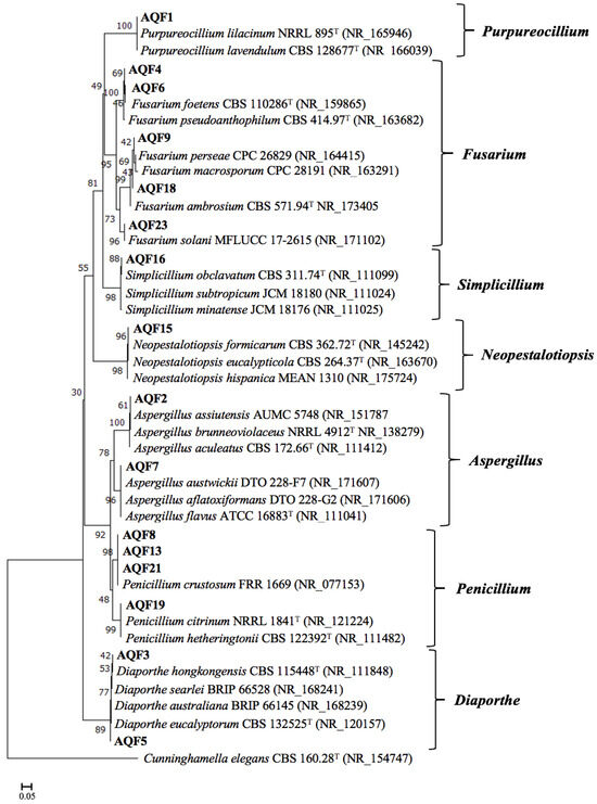 In total, sixteen fungal endophytes were successfully recovered from the root, stem, and leaf parts of A. yunnanensis based on distinct morphological characteristics. Most of the endophytic fungi were isolated from roots (43.75%, seven isolates), followed by stems (37.50%, six isolates) and leaves (18.75%, three isolates). Based on morphological and microscopic characteristics, they belonged to different seven genera: Fusarium, Penicillium, Aspergillus, Diaporthe, Neopestalotiopsis, Purpureocillium, and Simplicillium. In support of these results, ITS sequence analysis revealed that there were 14 fungal isolates that reached over 99% in similarity to the closest match, except for two strains, AQF5 (95.33%) and AQF23 (98.83%) (Table S1). The phylogenetic tree further confirmed that fungal isolates were identified as the following: Purpureocillium lilacinum AQF1, Penicillium citrinum AQF19, Penicillium crustosum (AQF8, AQF13, AQF21), Aspergillus assiutensis AQF2, Aspergillus austwickii AQF7, Diaporthe hongkongensis AQF3, Fusarium macrosporum AQF18, Fusarium foetens (AQF4, AQF6), Fusarium perseae AQF9, Neopestalotiopsis formicarum AQF15, Simplicillium obclavatum AQF16, Fusarium sp. AQF23, and Diaporthe sp. AQF5 (Figure 1).