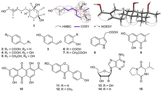 Compound 1 was identified as a white and amorphous powder. Its molecular formula C15H28O3 was deduced by a sodium adduct ion at m/z 279.1933 (calcd. for C15H28O3Na+, 279.1931) in high-resolution electrospray ionization mass spectrometry (HRESIMS), corresponding to two degrees of unsaturation. Three methyl singlets at δH 1.69 (H-11), 1.25 (H-12), and 1.17 (H-14), one methyl doublet at δH 1.05 (J = 7.2 Hz, H-13), and one oxymethylene broad singlet at δH 3.94 (H-15) were also observed in the 1H NMR spectrum (Figures S1 and S2). Analysis of the 13C NMR and HSQC spectra indicated 15 carbon signals attributable to one trisubstituted double bond [δC 127.0 (C-9) and 135.8 (C-10)], four methyls, five methylenes [including one oxymethylene at δC 69.0 (C-15)], two methines, and two oxygen-bearing nonprotonated carbons at δC 82.0 (C-1) and 75.5 (C-3) (Figures S3 and S4). This, in combination with HMBC correlations from H-11 to C-9, C-10, and C-15 and from H-15 to C-9 and C-10, suggested the presence of a 2-methylpent-2-en-1-ol substituent (Figure 2). Additionally, observations of COSY correlations suggested the existence of a 1,2,3,4-tetrasubstituted cyclohexane ring (Figures S5–S7). These suppositions were supported by comparison with the NMR data of 1 with those of the previously reported bisabolane-type sesquiterpene, citrantifidiol, showing a good agreement, except for a methyl group in citrantifidiol, which was replaced by an oxymethylene group at C-10 in 1 [δH 3.94 (br s)/ δC 69.0 (C-15)] [28].