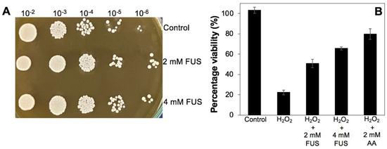 Given that S. cerevisiae was utilized as an excellent model organism to evaluate the potent antioxidant activity of bioactive compounds [6], yeast cells were firstly treated with 2 mM and 4 mM FUS. It turned out that FUS did not affect the growth or induce the cytotoxicity of yeast cells (Figure 3A). Even the growth of S. cerevisiae was slightly promoted by FUS. Lately, S. cerevisiae was treated with different concentrations of FUS and exposed to an oxidant H2O2. In terms of control, the exposure to 2 mM H2O2 strongly reduced the survival of yeast cells to 22.39 ± 2.30%. CFU counts indicated an increase in the survival of stressed yeast cells about 28.49% when being treated with 2 mM FUS compared to the control (Figure 3B). An increase in FUS concentration to 4 mM led to the highest rescue of survival, which was not comparable to ascorbic acid.