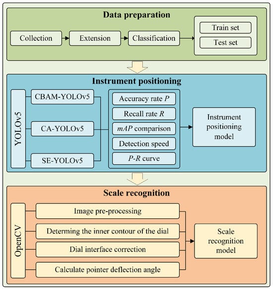 To minimize environmental interference on measurement accuracy and boost the precision and robustness of arrester instrument scale recognition, this study introduces a deep learning-based recognition method. The schematic diagram of the research methodology for this study is shown in Figure 1.
