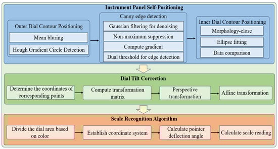 The study proposes a method for recognizing the markings on instruments. Initially, it establishes a self-positioning method for the instrument panel to determine the contours within the panel. Subsequently, a method to correct the tilt of the scale dial is developed, where the dial is rotated for adjustments, resulting in a corrected image of the instrument panel that lays the groundwork for further analysis or recognition of the panel markings. Finally, a scale recognition algorithm is introduced to obtain the results for instrument scale recognition. The method for recognizing instrument scales is illustrated in Figure 3.