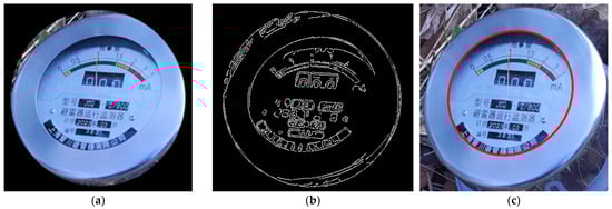 Step one involves performing mean blur on the input image to reduce the impact of random noise and quickly obtain the contour lines and the utilization of the Hough Gradient Circle Detection algorithm, as shown in Figure 4a to determine the location of the dial’s outer contour. This step aims to reduce background interference and save data on the circle’s center coordinates and radius.
