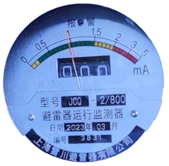 Perspective-transformed Image of the Instrument Panel. (Note: The Chinese characters in the image are as follows: Alarm, Model: JCQ-2/800, Surge Arrester Operation Detector, Date: March 2023, Number: 3831, Shanghai Leichuan Surge Arrester Co., Ltd.).
