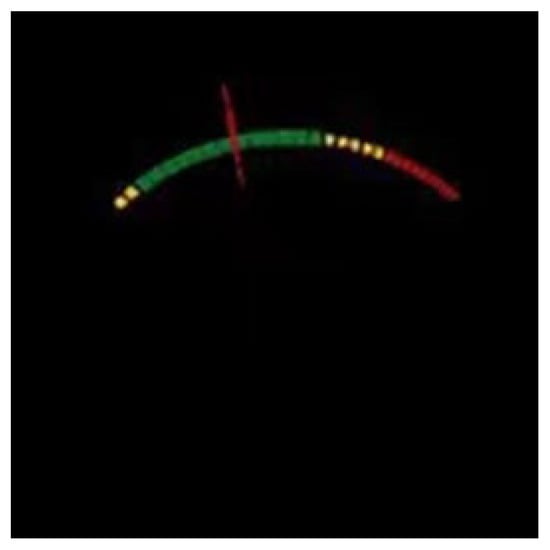 After correcting the dial, the designated colors on the instrument scale are extracted and located, preserving the three colors of yellow, green, and red in the scale dial and eliminating the rest. The result is shown in Figure 7. By iterating over the scale bars, the coordinate data for all scale points are obtained and stored separately in array form, facilitating subsequent calculations of the instrument scale.