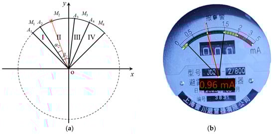 Ai (wh 3, 4) are the starting scales for each region; αi represents the deflection angle of the pointer from the starting line within its region; Mi is the scale range for an individual region; βi is the angle corresponding to the scale range of an individual region. The scale recognition result is shown in Figure 8b.