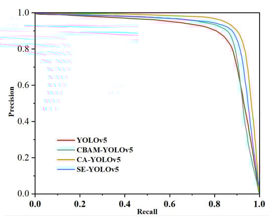 The data presented in Table 2 reveal that the integration of the attention mechanism module, while adding to the complexity of the base model, has resulted in a longer average detection time for the CBAM-YOLOv5, CA-YOLOv5, and SE-YOLOv5 models relative to the standard YOLOv5 model. However, in terms of mean average precision (mAP), the CBAM-YOLOv5, CA-YOLOv5, and SE-YOLOv5 models have seen respective increases of 1.9%, 4%, and 2.8% compared to the original YOLOv5 model. This confirms that the inclusion of the attention mechanism module can enhance the capability of extracting key features, thereby improving recognition accuracy. The P-R curves of the four target detection models are shown in Figure 9.