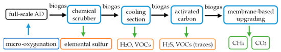 In situ H2S removal is performed through the precipitation of elemental sulfur localized within the digester using micro-aeration and iron dosing [25]. At the industrial level, micro-aeration showed higher desulfurization efficiencies (68–99%) than iron dosing (35–72%). Both techniques seem to be cheaper than most ex situ desulfurization methods [26] although the economic feasibility is essentially indicative due to a lack of data [25]. However, the main disadvantage of these techniques is finding the right operating conditions since an excessive dosage of iron and oxygen can lead to disturbances or inhibition of the AD process.