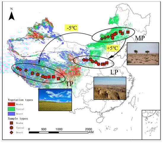 Three typical transects in China were selected: the Tibetan Plateau (TP), Mongolian Plateau (MP), and Loess Plateau (LP) (Figure 1). The transects were selected as natural grasslands free from human activities (Table 1). The MP spans about 1000 km at 141–1249 m above sea level, with a mean annual temperature (MAT) of about 2.64 °C. The MP has a mean annual precipitation (MAP) from 168.29 to 448.47 mm. MP soil is mainly chestnut soil. The TP spans about 1600 km at 4037–4592 m above sea level. The MAT is about −2.91 °C and the MAP spans from 191.71 to 619.86 mm. TP soil is mainly brown soil. The LP spans about 800 km at an altitude of 792–1684 m above sea level. The MAT is about 8.70 °C and the MAP spans from 215.50 to 591.18 mm. LP soil is mainly cinnamon soil. Each transect covers meadow steppe (MS), typical steppe (TS), and desert steppe (DS) gradients with increased precipitation from west to east. The microorganism data (bacteria and fungi) are from Yang [,].