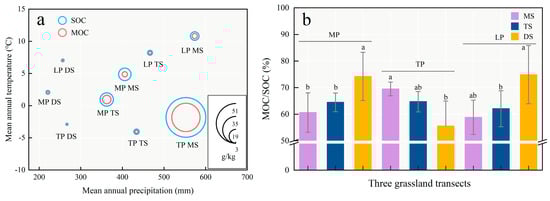 The average content of SOC from the three grassland transects was TP 21.08 g/kg, MP 12.39 g/kg, and LP 8.12 g/kg. The average content of MOC was TP (14.89 g/kg) > MP (8.07 g/kg) > LP (5.41 g/kg) (Figure 3a). The average value of MOC/SOC in LP soil was the highest (66.67%), and the average value of MOC/SOC in MP was the lowest (65.33%), while the TP was 65.99% (Figure 3b). Generally, the MOC content of the tested soil decreased with the increase in the temperature gradient. The highest MOC content in the three transects was the TP transect MS (36.63 g/kg), and the lowest was the TP transect DS (2.60 g/kg). The grassland type with the lowest MOC content in each transect was the DS.