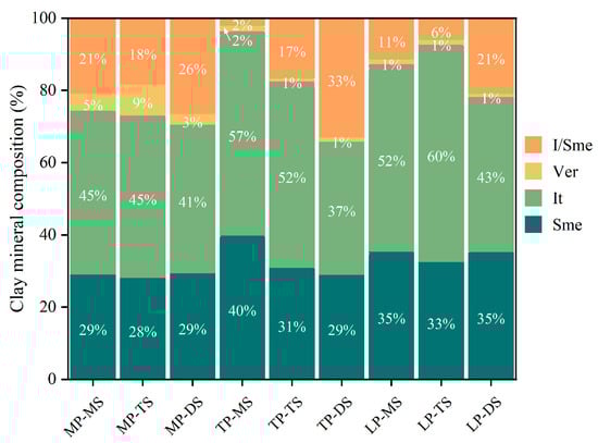 The correlation between the MOC and minerals gradually increased with decreasing temperature (Table 4). Only Ver (r = 0.42) was significantly correlated with MOC in the highest temperature LP. Ver was the next most significantly correlated with MOC in the MP (r = 0.66). Chl (r = 0.75), Sme (r = 0.83), and It (r = 0.41) were significantly correlated with the MOC in the TP with the lowest temperature, and I/Sme (r = −0.73) was significantly negatively correlated with MOC.