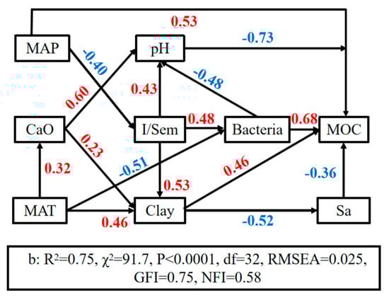 SEM showed the formation of MOC because of physical and chemical interactions. One of the factors that had the greatest direct effect on MOC was the soil pH. An increase in the pH will lead to an increase in organic matter desorption and colloid mobilization, which may affect the stability of microaggregates []. The SOC in soil agglomerates was physically protected by the binding of minerals, leading to the inability of microorganisms to decompose them, thus increasing the MOC content []. SEM has shown that temperature has a significant impact on the dynamics of bacterial populations []. In addition, the composition of bacterial communities is closely related to MOC []. I/Sme can promote the formation of MOC by influencing bacteria. Meanwhile, a few studies have noted that minerals were beneficial to the accumulation of soil microbial necrotic carbon, which was an important source of stable organic carbon []. The importance of climatic factors in controlling MOC has been recognized in a previous study []. Our results showed the strongest effect of the MAP on MOC []. Adequate soil moisture sustained plant growth so that plants further fixed SOC. On one hand, it ensures the input of carbon sources. On the other hand, it provides organic acids for root growth and microbial oxidative decomposition, reducing the pH value. It can be seen that there is a strong dependence between soil moisture, biomass production, and soil pH []. However, the effect of precipitation on MOC seems to obscure the role of other potential factors, such as the temperature, mineralogy, etc. []. I/Sme affected MOC by influencing clay mineral content in addition to the pH. The structure of clay minerals led to variable charges at their edges and these edges could form strong interactions with organic groups. Soils with a higher CaO content also had a higher pH, and CaO indirectly affected MOC by influencing the pH. In addition, soil oxides exhibited a high zero charge point. This enabled negatively charged organic groups to adsorb or react with permanently negatively charged clay minerals at most pH values below zero charges [].
