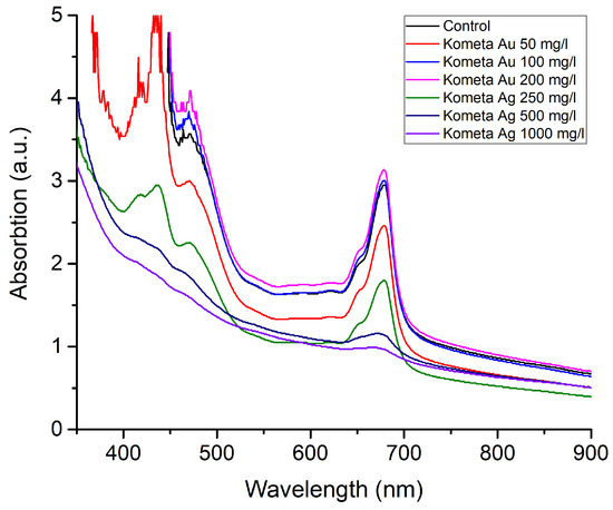 The results of light absorption for the ‘Kometa’ genotype after 48 h of exposure to AgNO3 and HAuCl4 are shown in Figure 3.